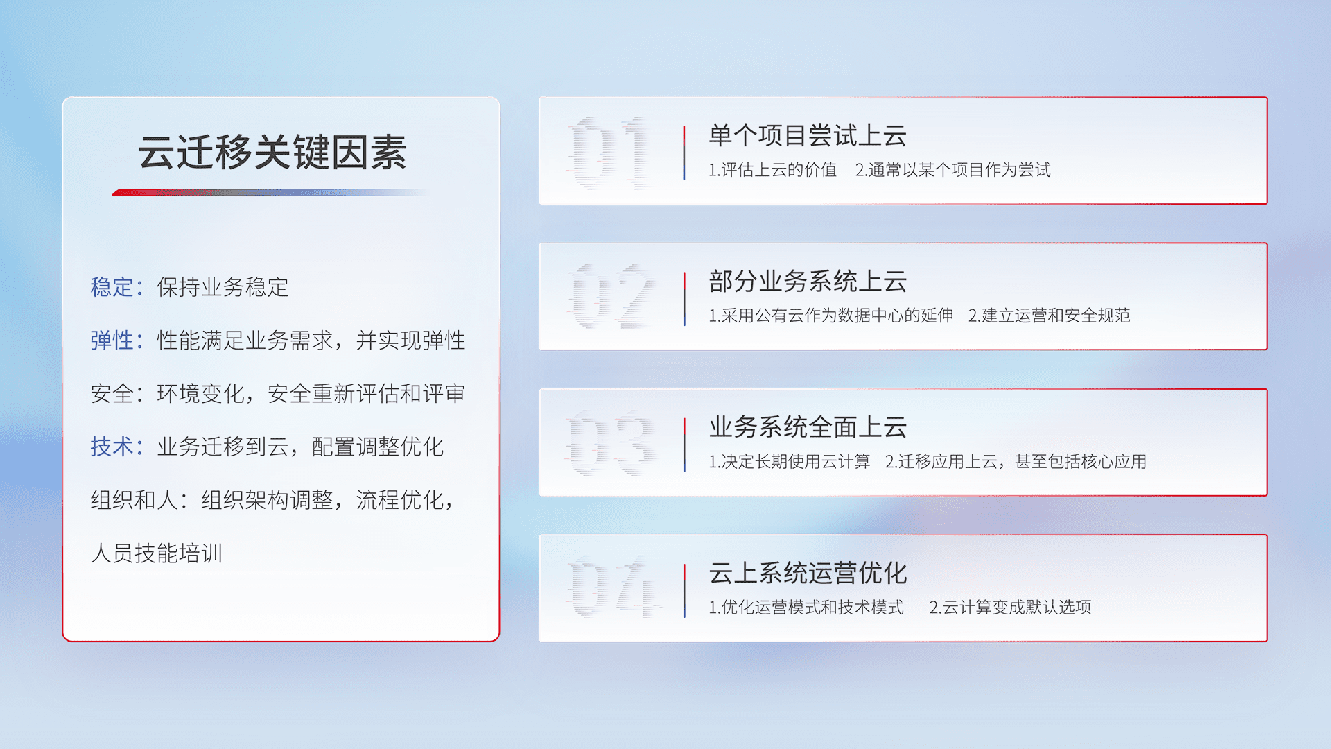 结合实际业务,,从规划设计、、、云平台选型、、、云原生改造、、、、数据迁移、、集成交付,,,,迁移全过程为客户识别最佳上云路径,,,做好风险识别管理,,设计网络架构、、身份权限、、、、安全审计合规、、、操作审计、、、、日志审计、、、监控告警策略、、、、多站点容灾设计等,,,,对云上基础设施进行整体规划,,提升IT治理水平,,,,以满足弹性、、、高可用、、高性能的需求。。。
