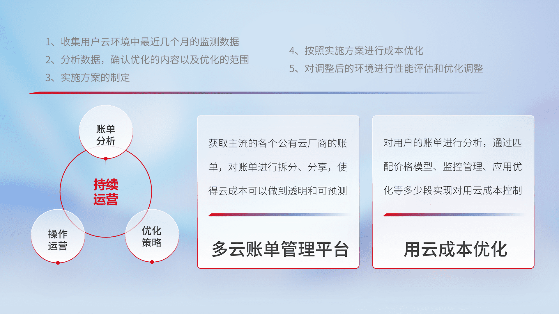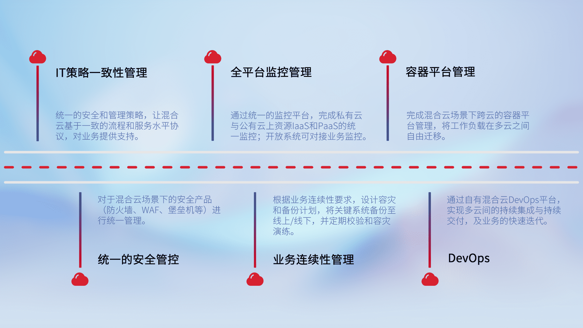 通过多云纳管,,,,以统一的资源数据模型把客户的云资源进行抽象和封装,,,进而实现对多云资源的统一操作,,,,保障云资源管理的可靠性、、稳定性与可用性。。。。量身定制化运维内容,,,,配置、、、开发运维、、、、补丁管理、、备份、、监控、、认证和访问管理、、、、审计和日常巡检等,,,保障在用云过程中的可靠度,,,稳定度以及高可用率。。。。