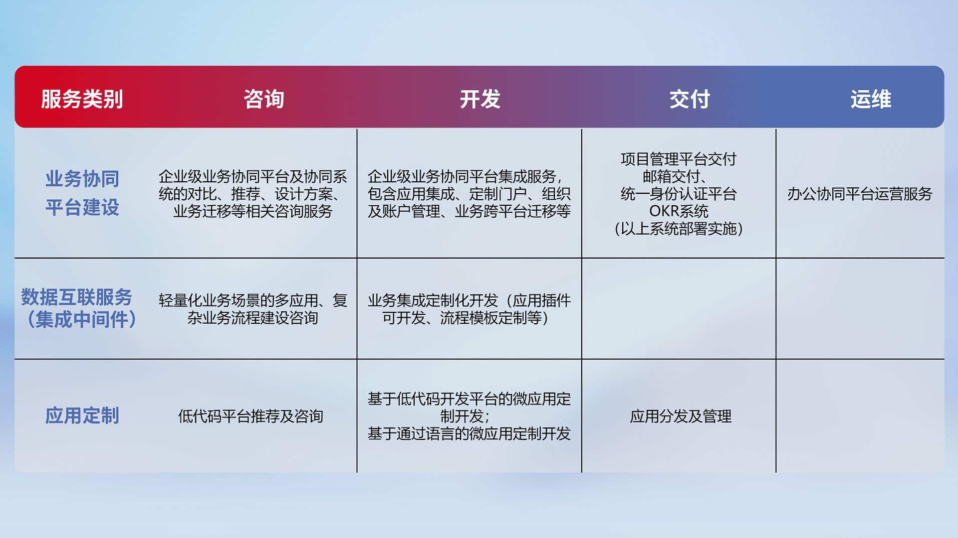 针对钉钉、、、、企微、、IDaas等平台级产品提供产品的规划、、、、方案、、、、交付、、定制化开发等服务,,实现如统一协同办公、、、、智能客户服务、、、、混合会议管理、、智能数据查询、、等业务场景,,,,实现数字化转型。。